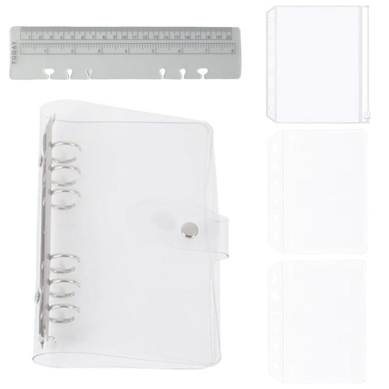 YFFSFDC システム手帳 PVC バインダー ミニ6穴手帳 ポケットサイズ PVCクリア素材 柔らかい ボダン付き クリアポケット 3枚付き 定規付き ノート