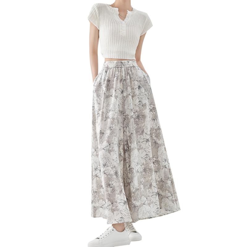 風プリント ハイウエスト 薄手 9分丈パンツ 普段使い 部屋着