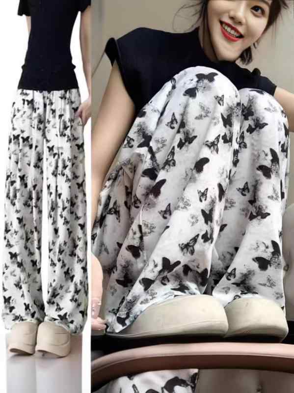 風 ワイドレッグパンツ 春夏 薄手 ハイウエスト バタフライ ゆったり 接触冷感 ストレートパンツ ロングパンツ 黒 白
