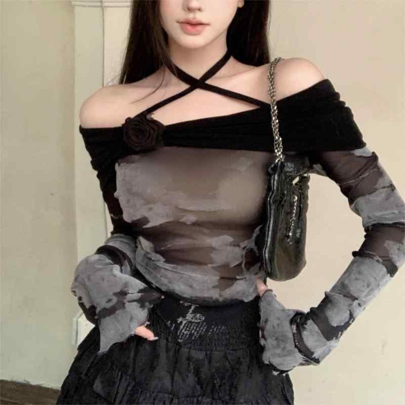 Tシャツ レディース オフショルダー 長袖 トップス タイト スリムフィット アシンメトリー 変形デザイン 配色切り替え