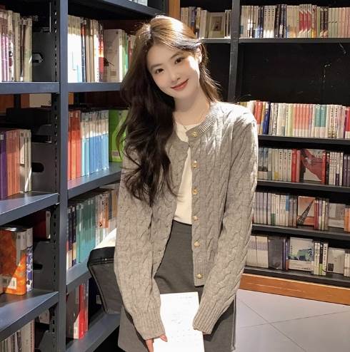 【P2倍&クーポン有】ニット カーディガン 前開き ケーブルニット ボタン トップス アウター 秋 冬 普通丈トップス 長袖 萌袖 クルーネック 丸首 スリム 細身 スマート グレー 灰色 ホワイト 白 オフィス 学校 大学 職場 バイト 旅行 ホテル レストラン 外遊び 1