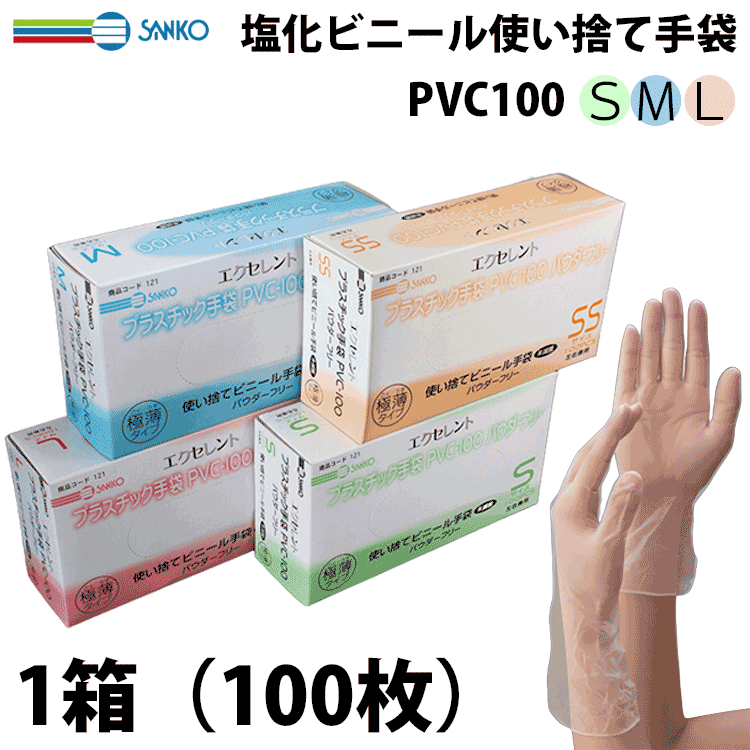 使い捨て手袋 ディスポ手袋 三興化学工業 PVC100 エクセレントプラスチック手袋 粉なし パウダーフリー ビニール手袋 100枚入り