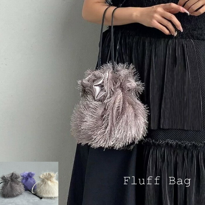 Fluff Bag 巾着バッグ 毛 ふわふわ レディース バッグ バッグ こぶり お洒落 ゴージャス ショルダー 手提げ 2way 内ポケット 個性的 デイリー オケージョン 小さいサイズ アイボリー グレー パープル オリジナル巾着付き