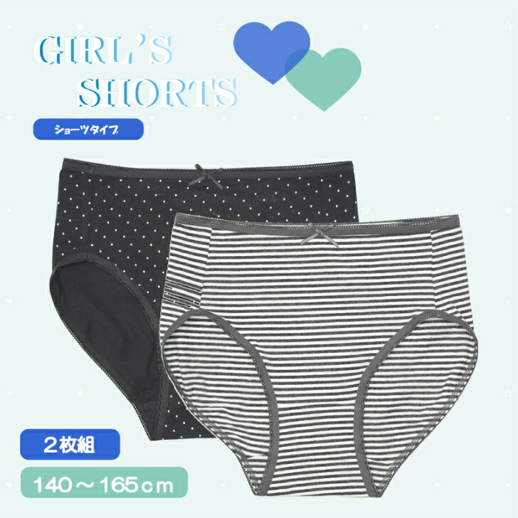 ジュニア プリントショーツ 2枚組 女の子 綿混 下着 ショーツ パンツ 柔らかい ストレッチ プリント リボン ウエストゴム ゴム 子供 女児 小学生 中学生 ドット柄×ボーダー柄 140 150 160 165 11280