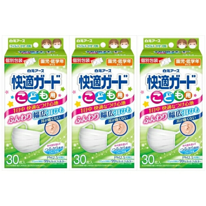 白元アース 快適ガード マスク こども用 30枚入 × 3箱セット 個包装 子供 園児 低学年用 まとめ買い 送料無料