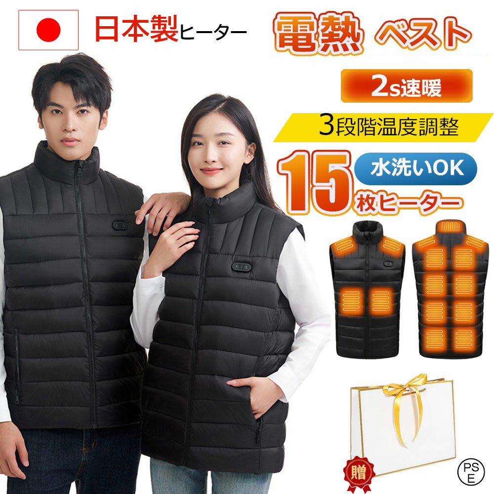 【2025冬新作】電熱ベスト ヒーターベスト レディース 日本製繊維ヒーター 15箇所発熱 加熱ベスト 発熱ベスト 電熱ジャケット 3段温度調整 2つボタンで独立制御 防寒ベスト USB給電 15エリア発熱 暖か 充電式 電熱ウェア防寒 速暖 大きいサイズ 男女兼用 電熱服 PSE認証済