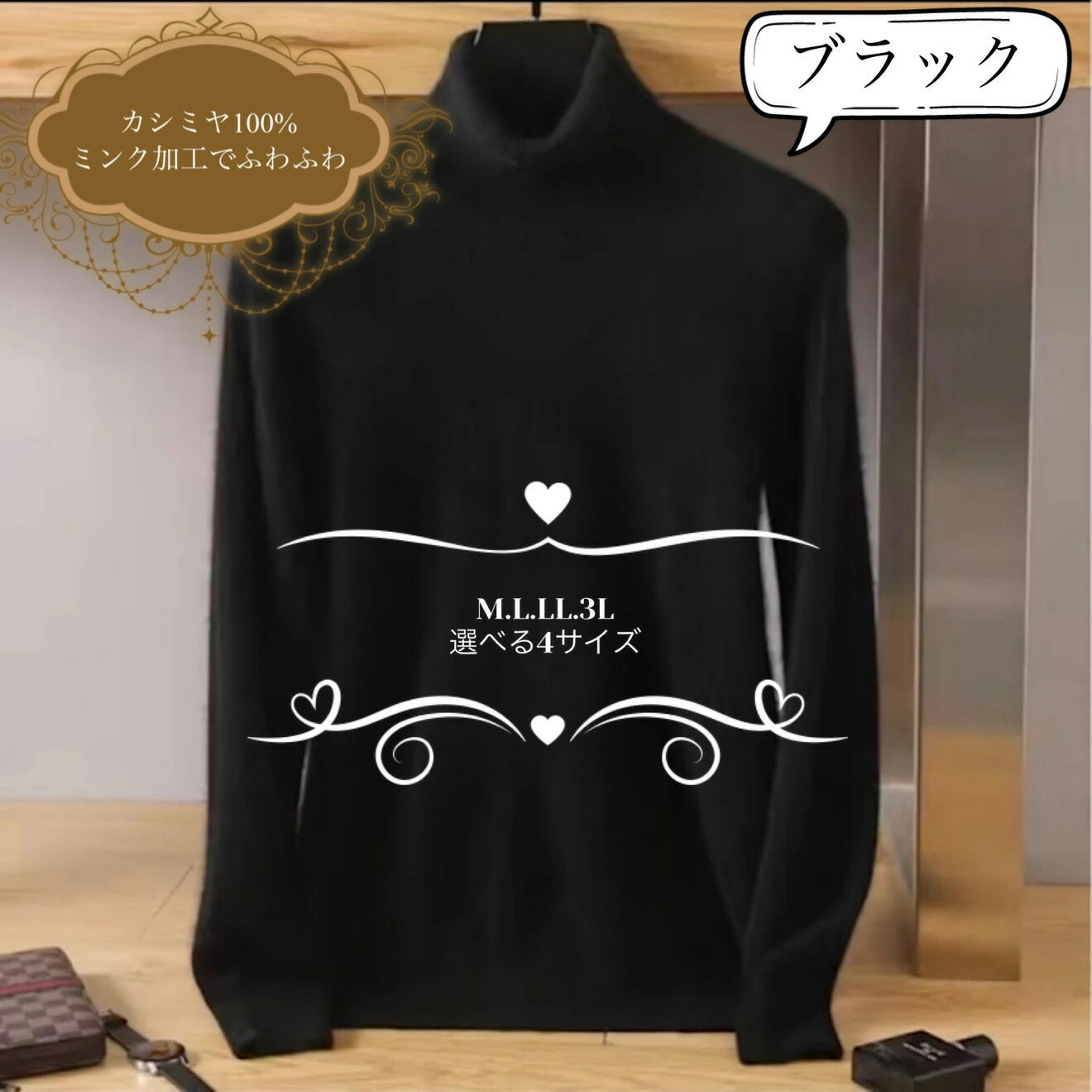 カシミヤ100% 丸首ネックセーター ラウンドネック ブラック 選べる4サイズ M L LL XL 肌触りのいいふわふわのミンク加工 カシミア