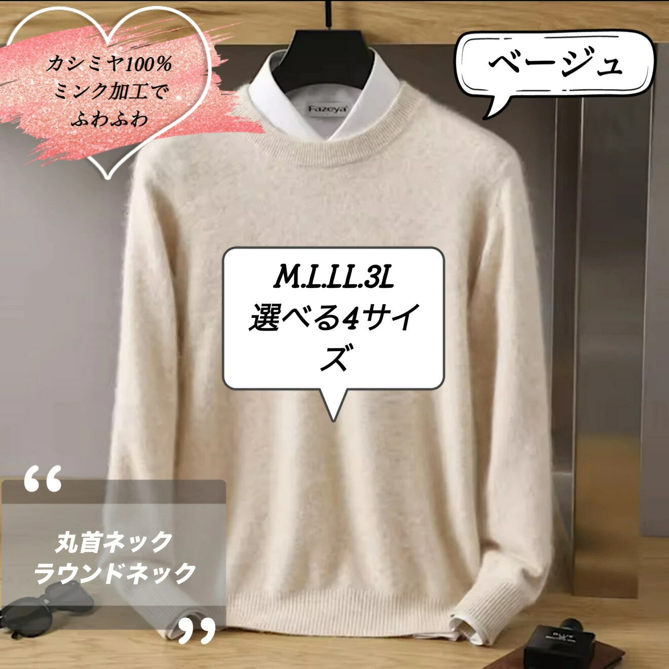 カシミヤ100% 丸首ネックセーター ラウンドネック ベージュ 選べる4サイズ M L LL XL 肌触りのいいふわふわのミンク加工 カシミア