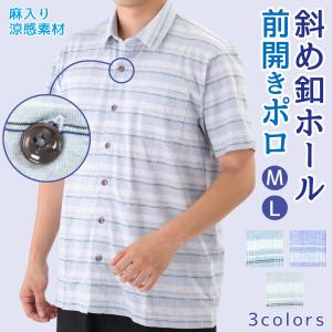前開きポロシャツ メンズ 半袖 斜めボタン シニア 麻混 涼感チェック柄 M/L/LL 着脱簡単 おしゃれ カジュアル 上品デザイン 洗濯機OK
