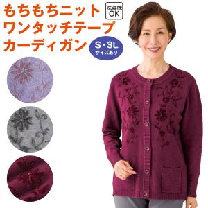 もちもちニット ワンタッチテープカーディガン レディース 秋冬用 S〜3L 洗濯機OK 花刺繍 前ポケット付 ゆったり設計 高齢者向け 介護用にも最適