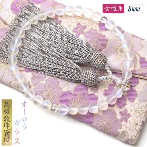 数珠 女性用 8mm オーロラガラス 高級 数珠入れ 付 頭房 硝子 略式数珠 法事 葬儀 念珠 通夜 人絹房 じゅず