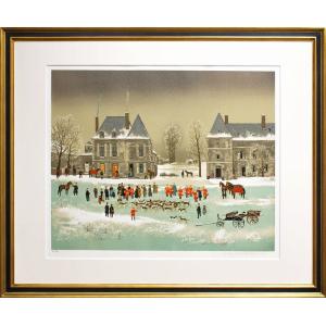 ミッシェル・ドラクロワ 「 狩 」( 出発 ) リトグラフ 版画 版画 絵画 外国の風景 海外作家 フランス パリ 雪 雪景色 早朝 冬 猟犬 かわいい 送料無料