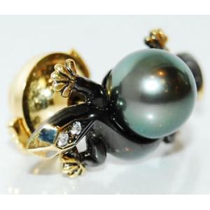K18 ブラックメッキ トカゲ/リザード デザイン ブラックパール/黒真珠&ダイヤモンド ラペルピン/ピンバッジ