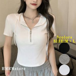 パーカー tシャツ レディース 半袖 ハーフジップ プルオーバー ショート丈 クロップド カーブヘム ラウンドカット フード かわいい Y2K