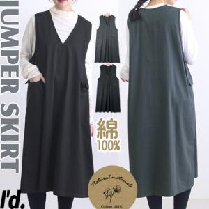 ツイル 綿100% ポケット付き ラクゆる Aライン ノースリーブ ワンピース Vネック ジャンパースカート ロング丈 ジャンスカ レディース 9634