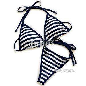 ネイビーxホワイト ボーダー ビーチクイーン Tバック 三角ビキニ 水着 t64 サーフィン ブラジリアン 紐パンツ 競泳 水泳 スイムウェア