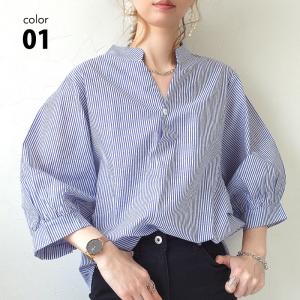 ストライプ シャツ バトンカラー スタンドカラー ランタンスリーブ キャンディースリーブ カジュアル レディース 春 秋 ブルー フリー トップス ストライプ