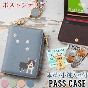 パスケース 本革 リール付き 定期入れ 二つ折り ボストンテリア 犬 レディース 入学祝い 就職祝い プレゼント おしゃれ 2枚 ICカードケース 東京アンティーク