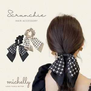 シュシュ リボン 格子 柄 黒 ベージュ ブラック 大きめ サテン 大人 きれいめ 上品 かわいい おしゃれ