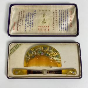 金喜堂製 特許「金寿」 かんざし 櫛 螺鈿細工入り 高級櫛&かんざしセット 化粧箱付き 昭和レトロ 髪飾り アンティークコーム