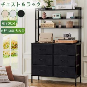 3段木製ディスプレイラック付きハイチェスト タンス 布製引き出し6杯 ロボット掃除機OK 衣類収納 オープンシェルフ収納棚 本棚 整理棚 シンプル 幅80cm