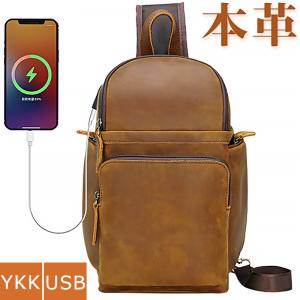 一粒万倍日 カブト型 本革 ボディバッグ メンズ ワンショルダーバッグ USBポート付き iPad対応 左右肩付替え オイルプルアップレザー ブラウン
