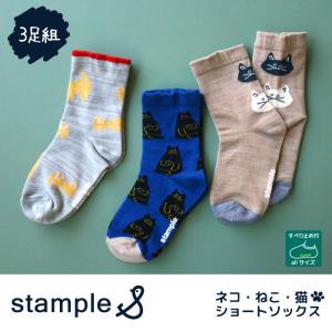 stample スタンプル ネコ・ねこ・猫 クルーソックス 3足組 子供 ソックス キッズ おしゃれ ユニセックス 滑り止め 履きやすい アニマル 72821