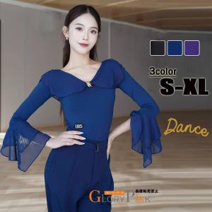ダンス トップス レディース 社交ダンス 上着 長袖 Vネック フレアスリーブ シフォン ダンス衣装 レッスン フィット きれいめ S M L XL 黒 ネイビー パープル