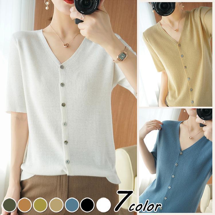 Tシャツ ニットソー レディース 春夏 半袖カットソー vネックニットカーディガン 無地 カットソー ストレッチ オシャレトップス白 プルオーバー オシャレ