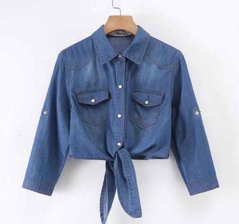 デニムシャツ レディース ショート丈 前結びシャツ 長袖 送料無料 前縛り ブラウス トップス ロールアップ 羽織り カジュアル 大きいサイズ 大人 かわいい