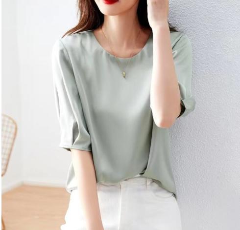 シルク調 送料無料 丸首 半袖 トップス ピンク ブラウス 夏 シャンバン レディース オフィス ブラック ホワイト ミント ビジネス 通勤 グリーン