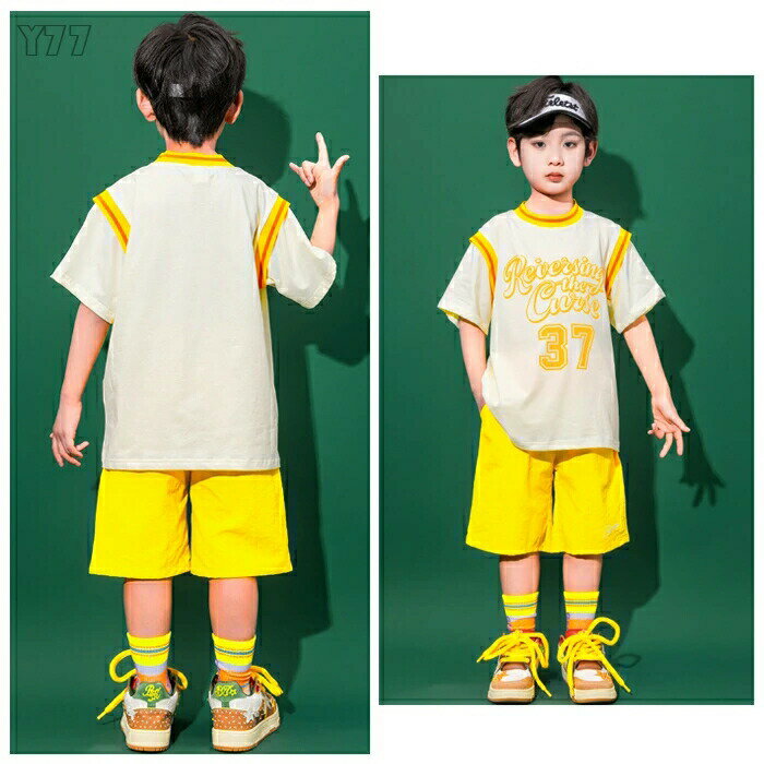 キッズダンス セットアップ イエロー 女の子(ベスト+スカート) 男の子(Tシャツ+ショーツ) hiphop K-pop 演出服 応援団 舞台 団体服 躍動感いっぱい ダンス衣装 個性プリント 原宿系 ダンスウェア ジャズダンス チアガール衣装 子供ダンス 110 120 130 140 150 160 170 180