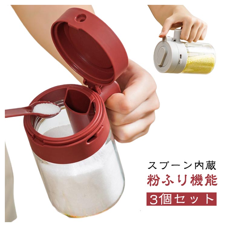 スプーン内蔵 大容量 3個セット 調味料入れ スパイスボトル 3個セット 耐熱ガラス 洗いやすい 湿気防止 砂糖入れ 300ml 調味料缶 キッチン収納 片手で簡単 コショウ入れ 片栗粉入れ容器 おしゃれ 調味料ポット 調味缶 塩
