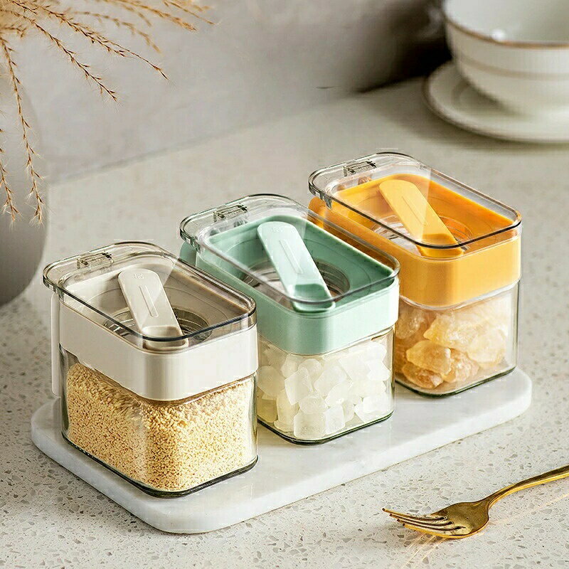 スプーン蓋付きセパレート調味料ボックス、キッチン家庭用調味料瓶、防湿・防塵調味料収納ボックス、透明窓付き調味料ボックス、回転式スプーン蓋付きセパレート調味料瓶、密閉式防湿塩・砂糖収納ボックス、ワンボタン開閉調味料ボックス
