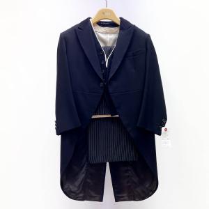 尾州素材のスリムなモーニングコート&ベストとSupertexのワンタックの縞パンツの3点セットRM1826-E1822