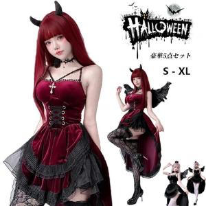魔女 デビル コスプレ 悪魔 セクシー 5点セット パニエ 黒 赤 悪魔 吸血鬼 ハロウィン 衣装 大人 レディース 可愛い 角 ワンピース エルフの耳 ニーソックス付き