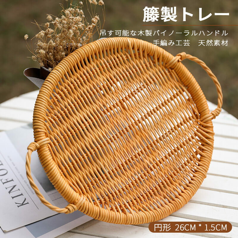 お買い物マラソン【P5倍】ラタン製プレートトレイ 円形トレー 手編み 小物入れ 菓子皿 果物トレイ 小物入れ 小物置き お菓子入れ 籐製 トレイ 収納トレイ 丸型 手織り 安全 耳付き ハンドル付き インテリア雑貨 収納雑貨 手織り