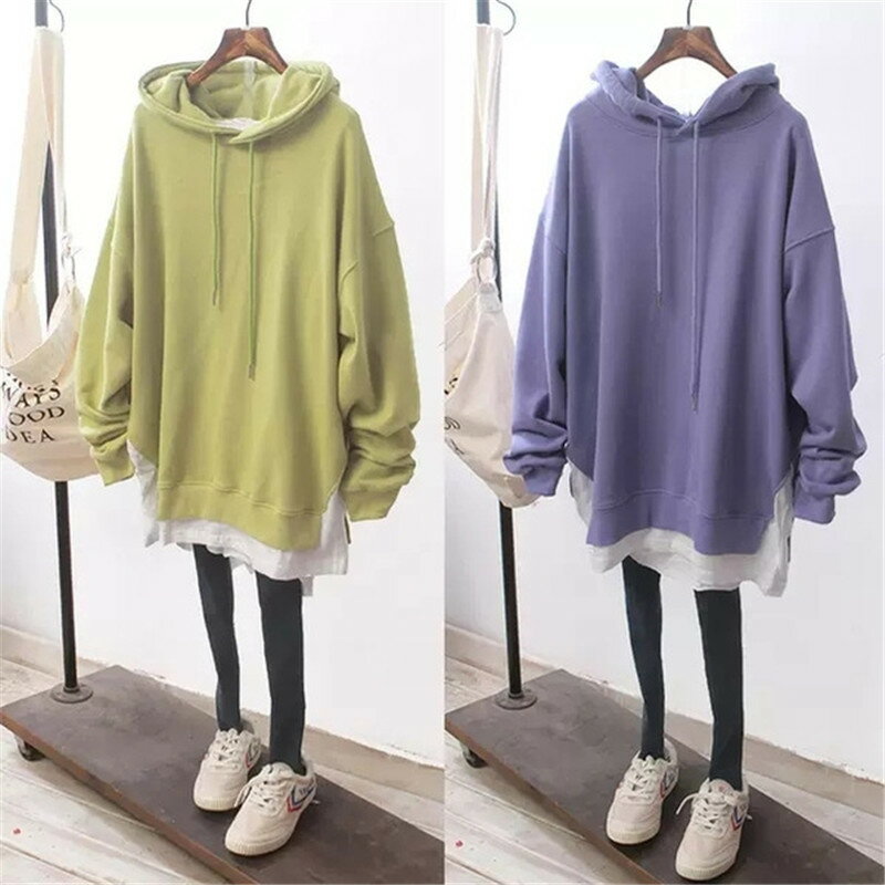 重ね着風 レディース トップス 長袖 プルオーバー パーカー ゆったり スウェットパーカー トレーナー 送料無料 フード付き チュニック ルーズシルエット 無地 薄手 春秋物 カジュアル レイヤード