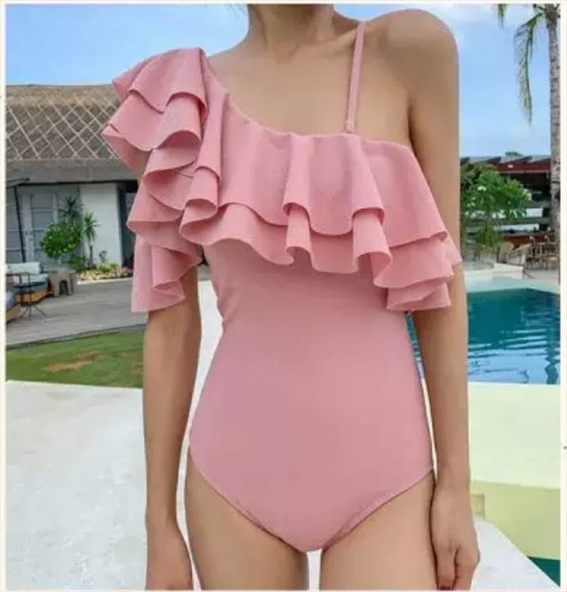 【P2倍&クーポン有】ワンピース 水着 体型カバー レディース ワンショル パッド付き 二の腕カバー シフォン フリル 大人可愛い 華やか ラブリー リゾート プール 海 スタイルアップ 韓インスタ映え M L XL ピンク すっきり 着痩せ 効果 彼女 ママ 10代 20代 30代
