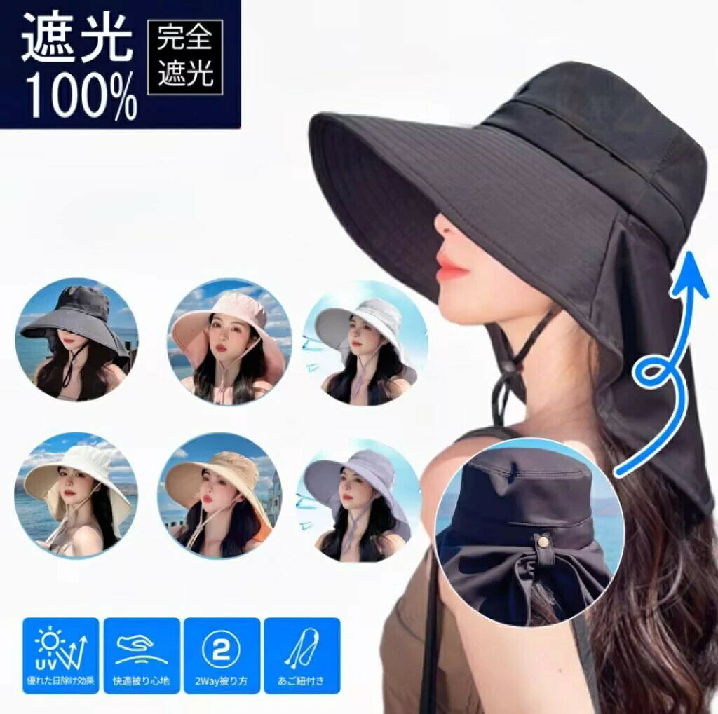 UVカット 帽子 レディース つば広 サンバイザー首筋まで日焼け対策 接触冷感 完全遮光 ポニーテール穴付き 通気性 軽量 折りたたみ 持ち運び便利 あご紐付き小顔効果 旅行 通勤日除けハット 手洗いおすすめ
