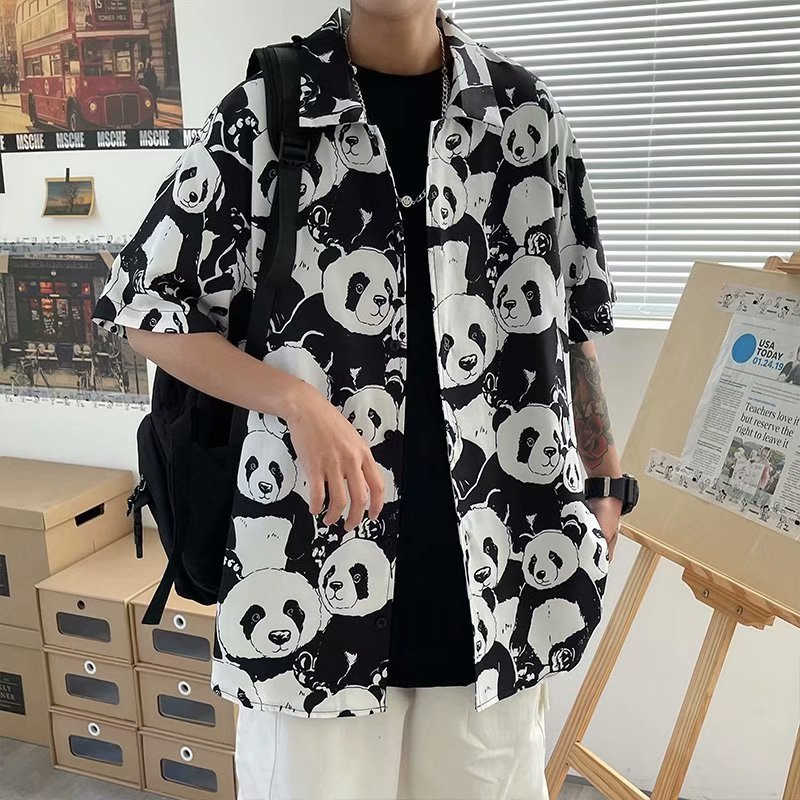 カジュアル カジュアル アロハシャツ 総柄 ゆったり パンダ柄 半袖 アロハシャツ メンズ 半袖 前開き アロハシャツ 開襟