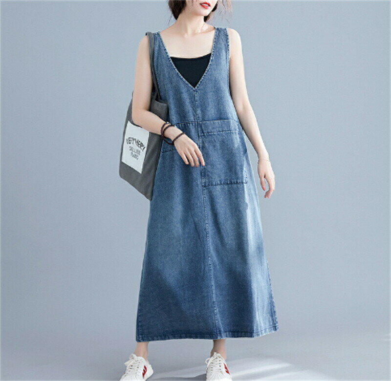 2色展開 ジャンパースカート デニム ロング サロペットスカート レディース 春 夏 秋 Aライン 大きいサイズ ノースリーブ カジュアル オールインワン ゆったり シンプル 無地