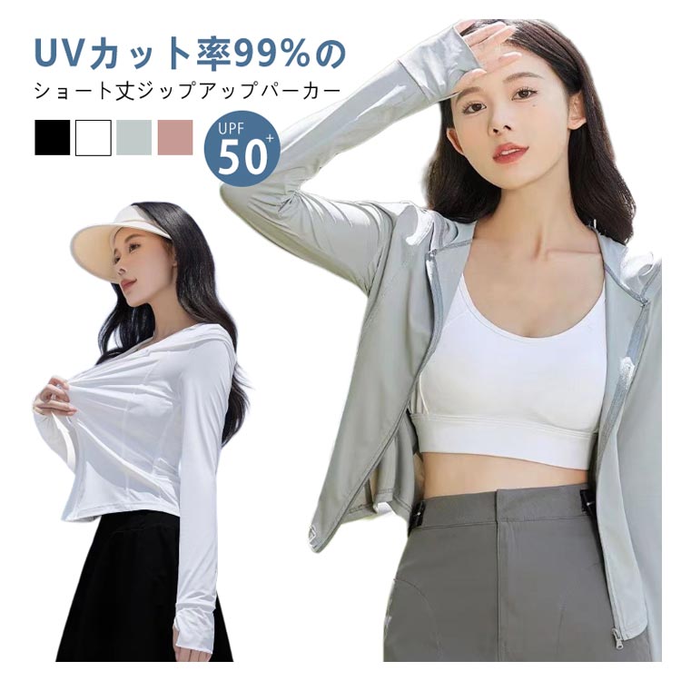 UVカット パーカー ショート UV 冷感 UPF50+ UVカット率99% 長袖 ラッシュガード ショート丈 スリム マスク 指穴 手袋 トップス アウター フード付き Vネック 薄手 吸汗 速乾 UVケア 熱中症対策 日焼け防止服 体型カバー