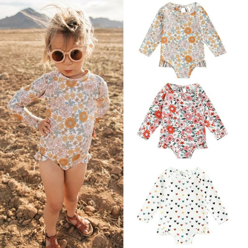 子供水着 女の子 長袖 水着 日焼け止め ワンピース キッズ ベビー水着 韓国風 キッズ スイミングウェア ラッシュガード こども みずぎ 海水浴 水遊び ビーチ 夏休み かわいい 水着 おしゃれ 90 100 110 120 130cm 海 プール リゾート フリル 露出控えめ 紫外線対策 総柄