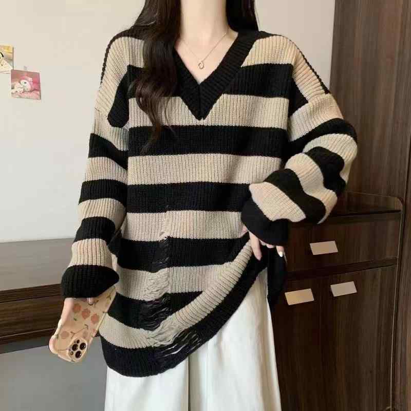 春 コーデ レディース ファッション オシャレ カワイイ シンプル きれいめ ナチュラル 上品カジュアル 婦人服 縞模様 セーター Vネック 長袖 プルオーバー ゆったり ミドル丈 トップス