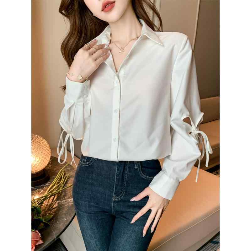 シャツ レディース 秋冬 長袖 インナー トップス ブラウス 白 蝶結び かわいい おしゃれ