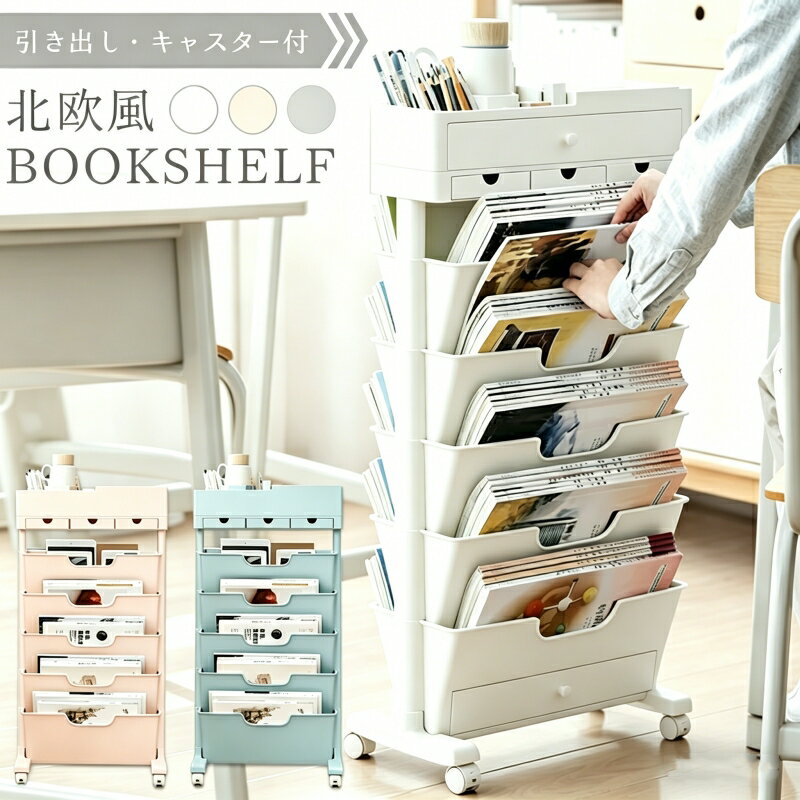 マガジンラック 北欧風 ホワイト5段 ブックシェルフ 本棚 スリム キャスター付き スリム 五段 大容量 教科書 収納 書類棚 隙間収納 隙間ラック サイドワゴン 絵本 書類整理 ラック デスクサイド収納 ブックスタンド 漫画 雑誌