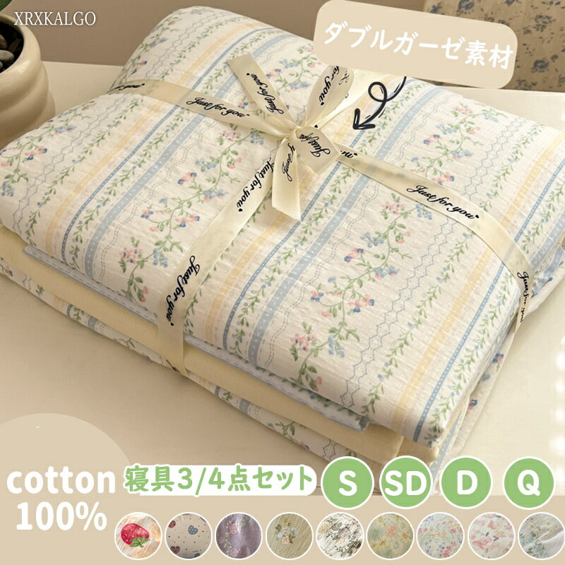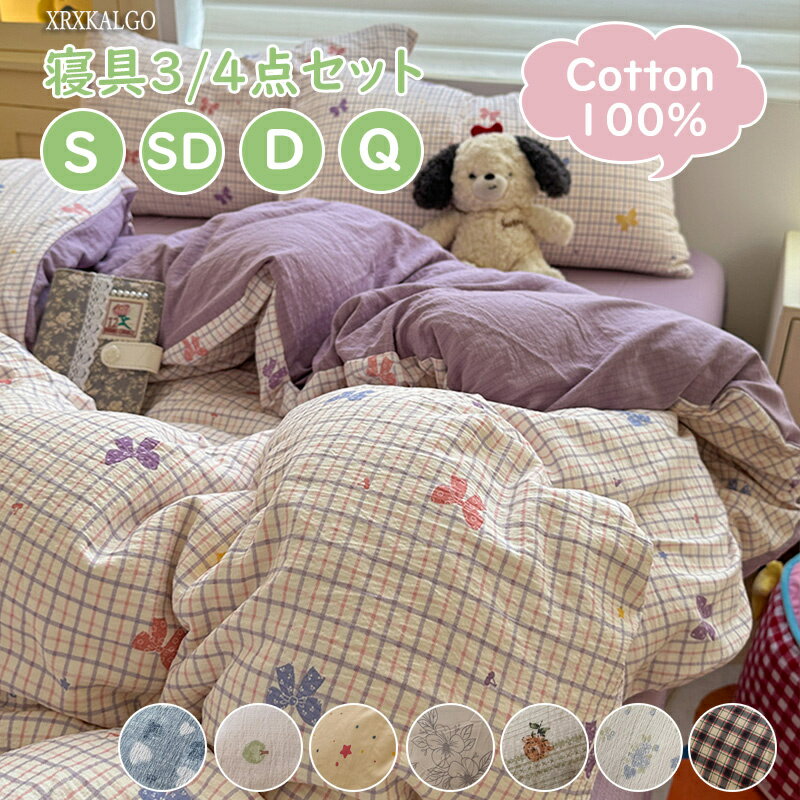 「8%OFF × P8倍」掛け布団カバー 寝具3/4点セット コットン100% ガーゼ シングル セミダブル ダブル クイーン チエック 花 ハート リンゴ 星 柔らかい 肌に優しい 布団シーツ 春夏秋冬 全綿 北欧風 可愛い