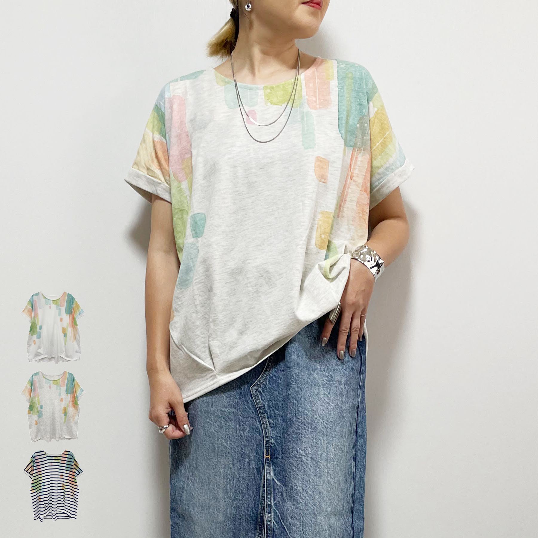 \SALE46%OFF/Tシャツ レディース 半袖 春 夏 水彩 ストライプ プリント タック 大人 体型カバー ゆったり 20代 30代 40代 50代