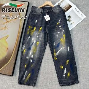 デニムパンツ ヨーロッパ製 RISELIN 綿混 色落ち ペイント ヴィンテージ加工 ジーンズ ボトムス ロングパンツ ズボン デニム パンツ カジュアル